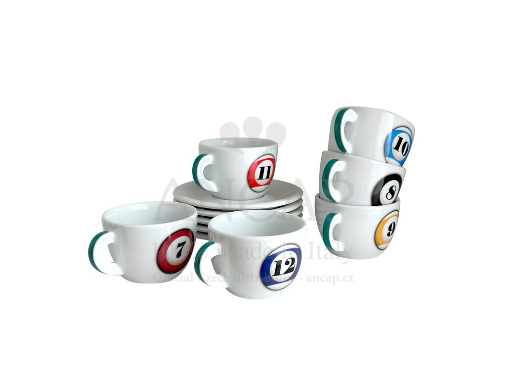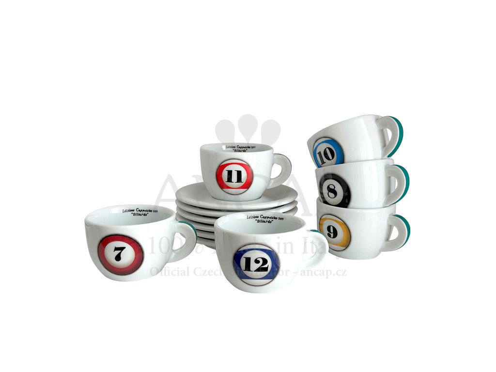 Dekorovaný porcelánový šálek na kapučíno s podšálkem z kolekce Biliardo, kde se italská elegance potkává s hravým světem kulečníku.