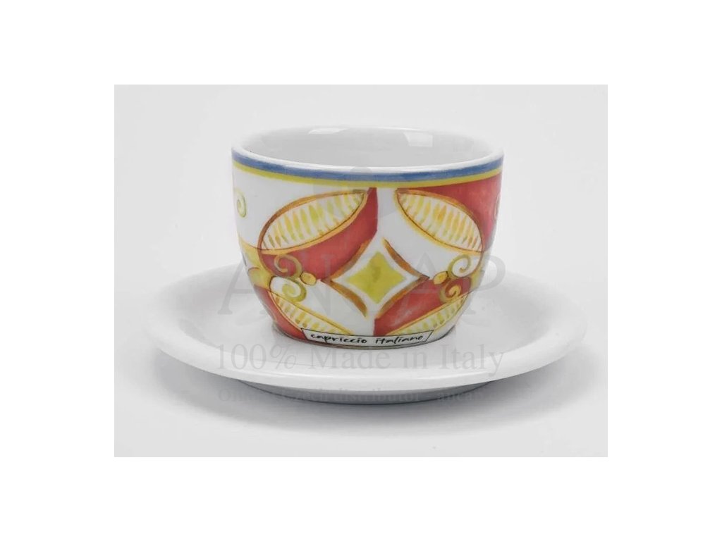 Dekorovaný porcelánový šálek na kapučíno s podšálkem z kolekce Capriccio Italiano inspirované středomořskými barvami s motivy rostlin a přírody pro výjimečný zážitek z vychutnání lahodné kávy.