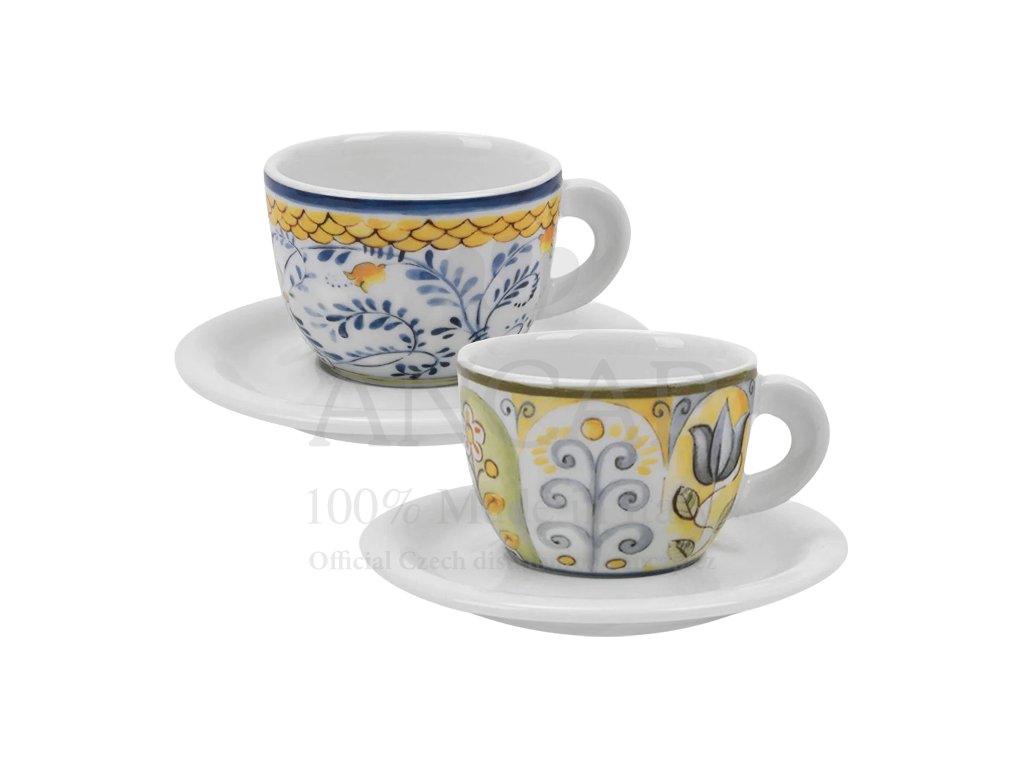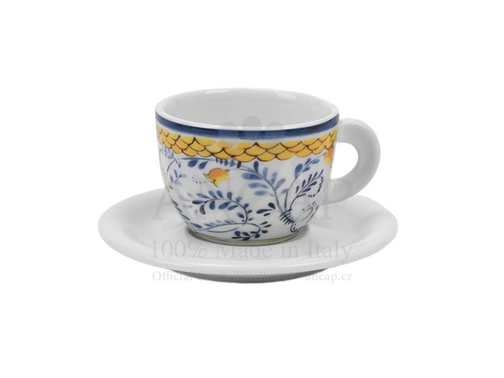 Dekorovaný porcelánový šálek na kapučíno s podšálkem z kolekce Capriccio Italiano inspirované středomořskými barvami s motivy rostlin a přírody pro výjimečný zážitek z vychutnání lahodné kávy.