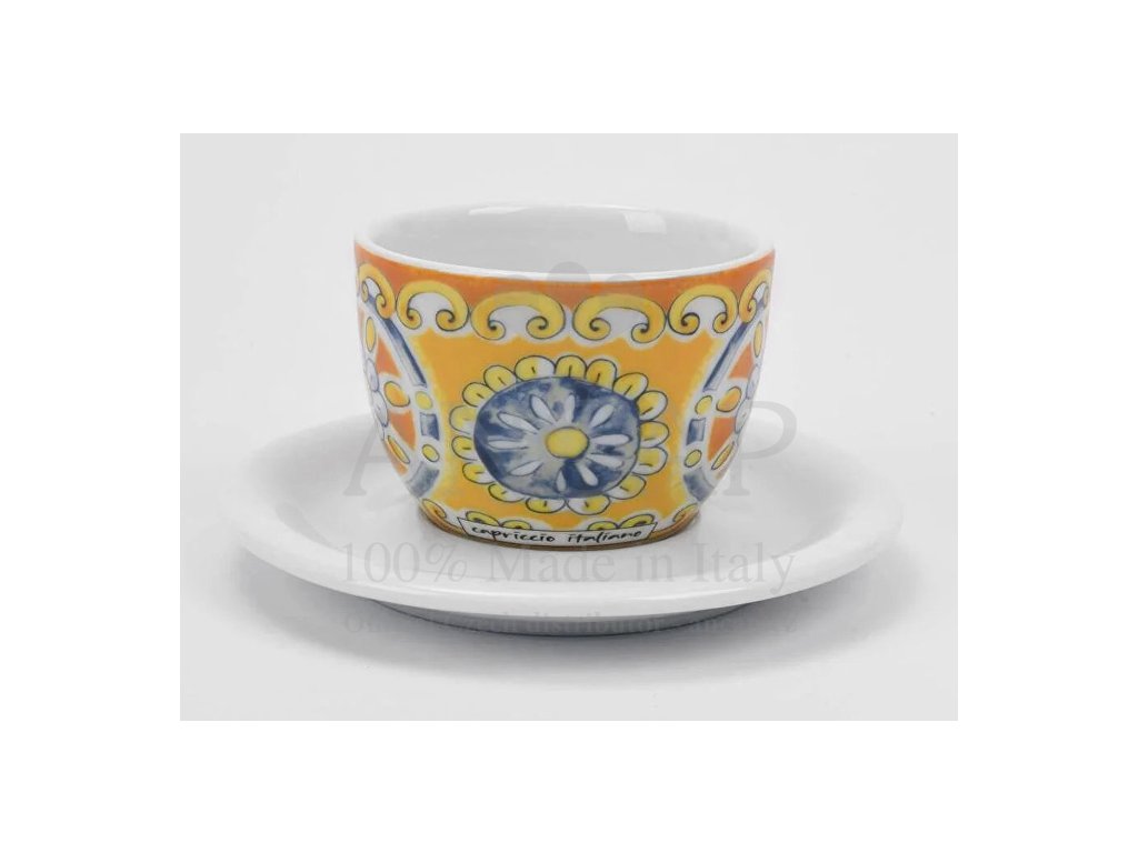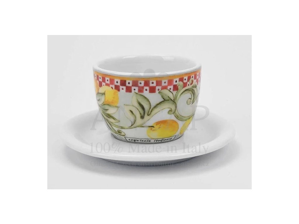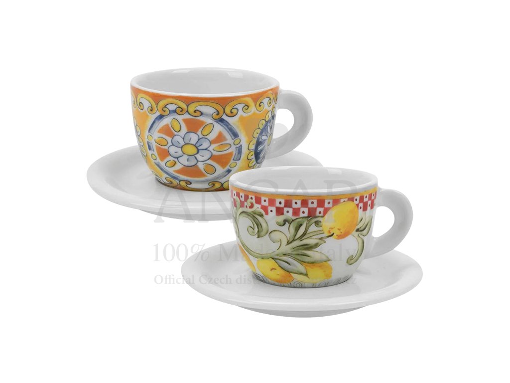 Dekorovaný porcelánový šálek na kapučíno s podšálkem z kolekce Capriccio Italiano inspirované středomořskými barvami s motivy rostlin a přírody pro výjimečný zážitek z vychutnání lahodné kávy.