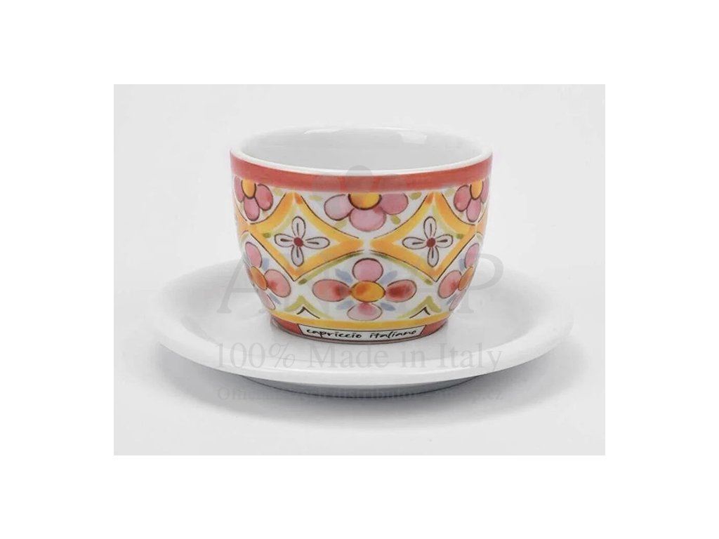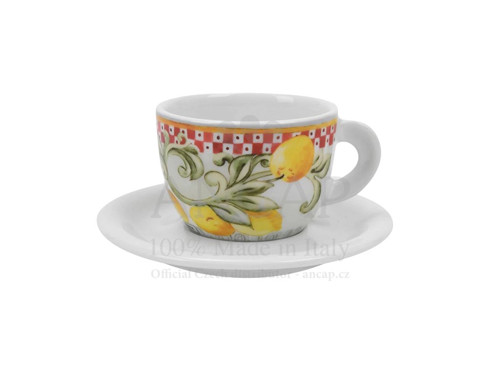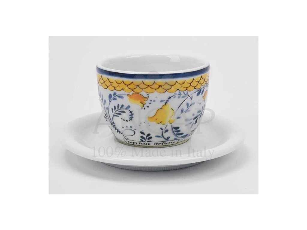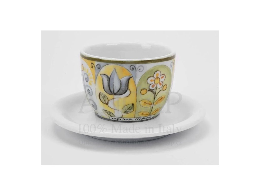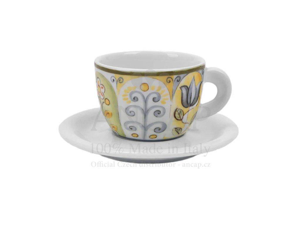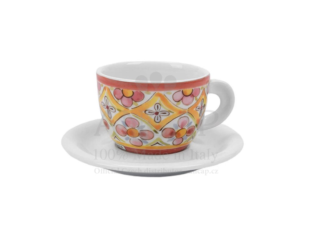 Dekorovaný porcelánový šálek na kapučíno s podšálkem z kolekce Capriccio Italiano inspirované středomořskými barvami s motivy rostlin a přírody pro výjimečný zážitek z vychutnání lahodné kávy.