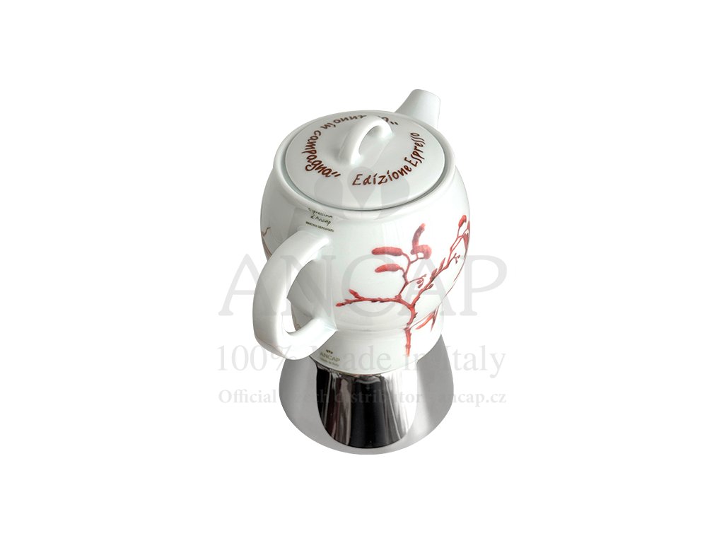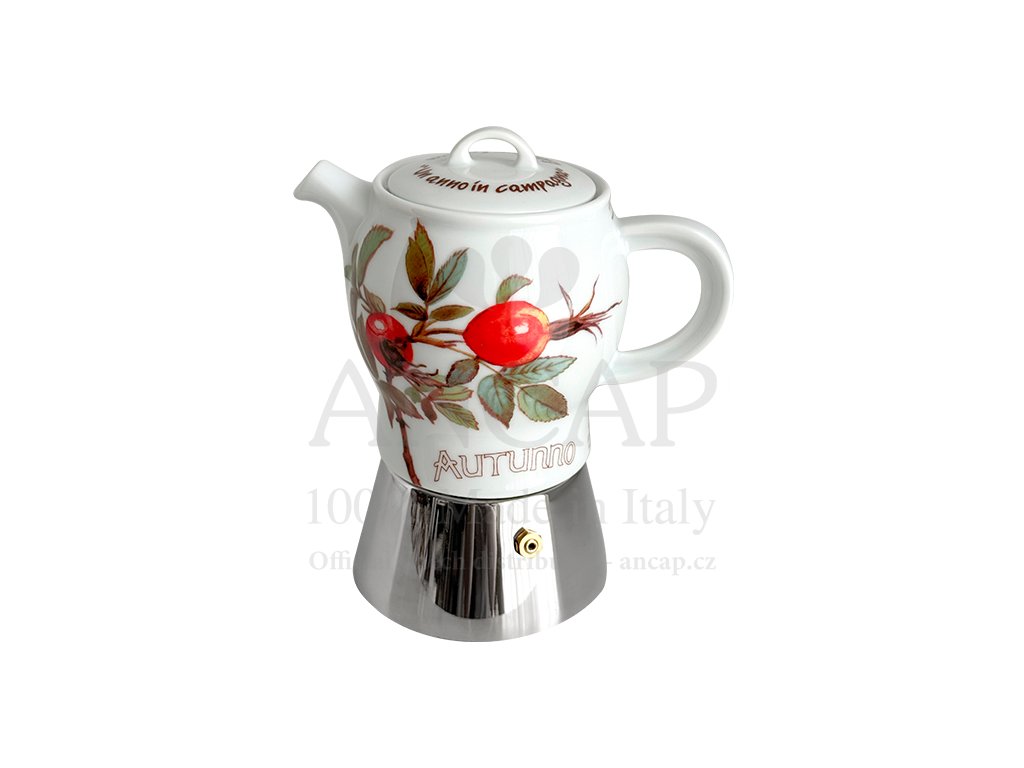 Dekorovaná silnostěnná porcelánová moka konvička na přípravu italského espressa je vhodná pro použití na většině známých vařičů, včetně klasického sporáku na pevná paliva, plyn, elektřinu a zejména na indukci. Dekor kolekce silnostěnného porcelánu na kávu Ancap Un Anno in Campagna zobrazuje roční doby a kalendářní měsíce.