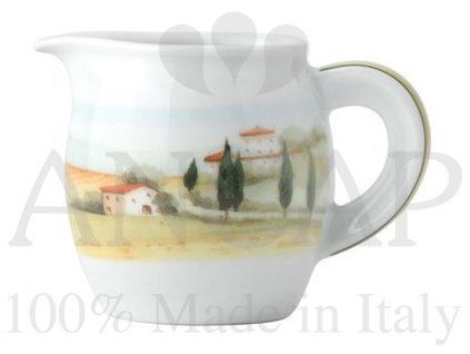 Dekorovaný porcelánový šálek s podšálkem zobrazující krajinu inspirovanou přírodou italského venkova. Vhodný pro každodenní profesionální používání. Silnostěnný živcový porcelán skvěle drží teplo a nápoj tak bude mít dlouho správnou teplotu. Kulaté dno šálku je důležité pro získání a udržení perfektní pěny.