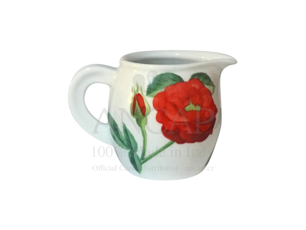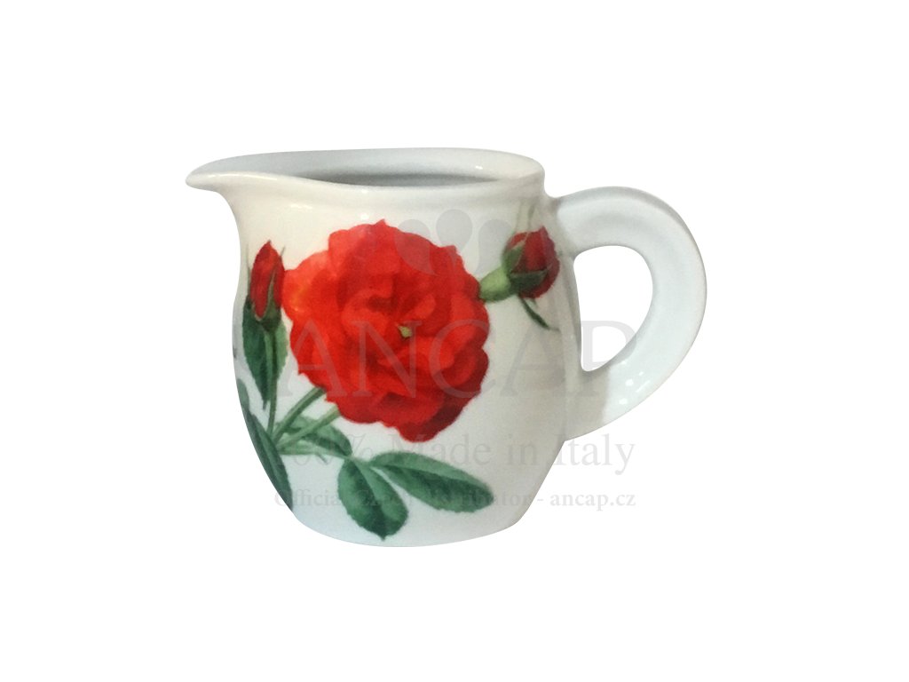 Dekorovaná porcelánová mlékovka s ouškem ze silnostěnného živcového porcelánu skvěle drží teplotu. Servírujte prodlouženou kávu správným způsobem, připravte do většího šálku espresso a do této konvičky hostovi nabídněte horkou vodu. Konvička na mléko nese motiv rozkvetlých růží. Sortiment značky Ancap se vyznačuje vysokou odolností. Kvalita použitých surovin garantuje pevný a obzvlášť silný porcelán vhodný pro každodenní profesionální používání.